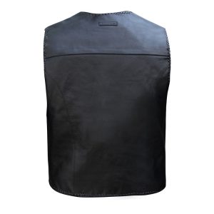 The Murray Vest is a classic leather vest, with leather braiding around the edges, and expander side panels for a custom and comfortable fit